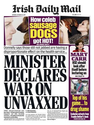 Irish Daily Mail – Minister declares war on citizens for exercising their right to decline a medical treatment. The demonisation of the unvaccinated continues…
