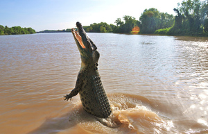 A Queensland, Australia man has escaped the jaws of a saltwater crocodile by stabbing it in the head with a pocket knife