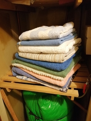We only had a small hot press, and the nappies, bedsheets, and our clothes had to fit too. And you always took the bottom towel, the large fold allowing one hand easy access to lift the others while the second hand withdrew the base holder. This allowed for a sort of natural rotation of towels.