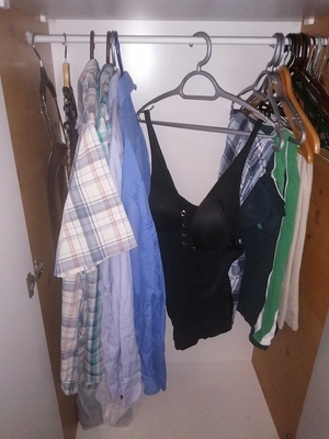 I found an item (above centre) definitely not mine, and I honestly do not know what to call it. With cups for boobs that a few years ago would have fit me (thank god I am losing fat), it is black with golden eyelets down the centre of the breast and a string to pull everything together. Perhaps a modern corset? Either way I was informed there is no need to send it home, it can stay until she returns, so it currently resides on the rail between my shirts and my trousers. For decorum, the cups face the shirts.