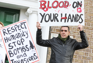 Irish Anti-War Movement protestors arranging “body bags” outside Leinster House following a march from the GPO calling for an end to the ‘forgotten’ war on Yemen exactly seven years after Saudi Arabia started bombing the country.