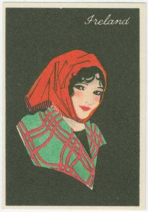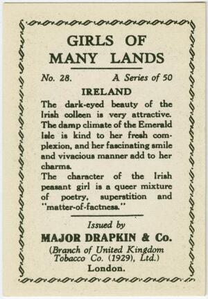 The Irish colleen represented on a 1929 cigarette card, part of a series depicting the Girls of Many Lands .