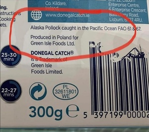 Called into local Tesco on Monday evening and lifted a box of fish branded “Donegal Catch”. What a misrepresentation – Alaska pollock caught in the Pacific and packaged in Poland! Hasn’t ever came close to anywhere in Ireland. Needless to say I put it down and bought chicken instead.