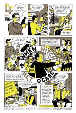 Thought some of your readers might be interested in the rarely heard story of when Alfred Hitchcock came to Sean O’Casey’s place for dinner. Culture File has the story here. Artist Philip Barrett also did a comix version of our story (above). To win the original artwork just follow @CultureFilePod and RT this tweet.