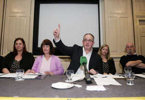 Solidarity TDs from left: Paul Murphy, Ruth Coppinger and Mick Barry outside Leinster House this morning.