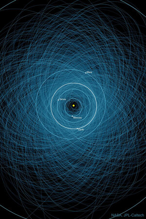 Pictured here are the orbits of the over 1,000 known Potentially Hazardous Asteroids (PHAs). These documented tumbling boulders of rock and ice are over 140 meters across and will pass within 7.5 million kilometers of Earth — about 20 times the distance to the Moon. Although none of them will strike the Earth in the next 100 years — not all PHAs have been discovered, and past 100 years, many orbits become hard to predict. Were an asteroid of this size to impact the Earth, it could raise dangerous tsunamis, for example. To investigate Earth-saving strategies, NASA’s Double Asteroid Redirection Test (DART) is planned for launch later this year. Of course rocks and ice bits of much smaller size strike the Earth every day, usually pose no danger and sometimes create memorable fireball and meteor displays.