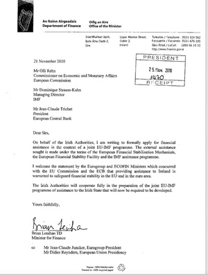 Portion of a letter sent to then Finance Minister Brian Lenihan from ECB President Jean Claude Trichet on November 19, 2010