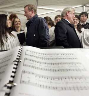 Enda Kenny and Eamon Gilmore with the Trinity Gospel Chapel Choir at the switching-on of the Oireachtas Christmas Tree lights.