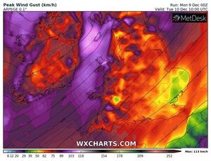 Tuesday will be a blustery day with strong winds and very gusty conditions associated with an active front moving eastwards across the country. Generally, winds will be below warning thresholds but damage to some structures and trees, already weakened from the effects of Storm Atiyah, is possible.