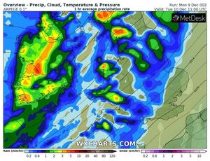 The Jet stream visible on the air-mass satellite view, this is powering up the low system which is developing out in the Atlantic and will bring heavy rain tonight and tomorrow along with strong winds off South coast.