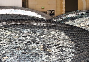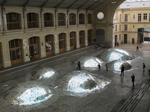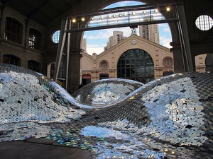 Wastelandscape by French artist Elise Morin: 65,000 old CDs hand-sewn into a 500-square meter surface draped over inflatable mounds to create “a still sea of metallic dunes.”