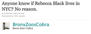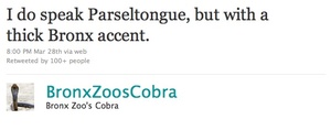 The venomous 20-inch Egyptian Cobra that escaped from the Bronx Zoo in New York at the weekend is still at large. A bite from one of these can kill an elephant in three hours. Fortunately, the scaly fugitive has so far merely set up a Twitter account.