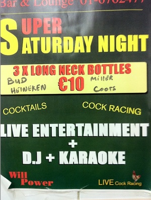 Poster for Doolan’s ‘Super Saturday Night’ in the Lido chipper on Pearse St. Live cock racing, is that even legal?