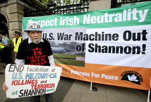 Veteran peace campaigner Colm Roddy joined a protest outside the Department of Transport HQ against the use of Shannon Airport for stopovers by US military.