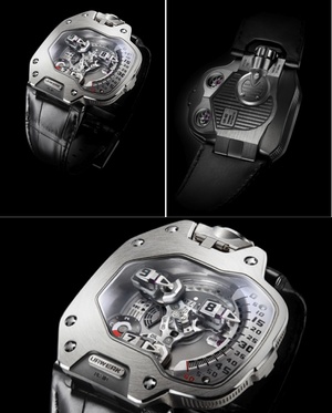 The UR-110 indicates time by means of a revolving satellite complication on planetary gears featuring three parallel hour/minute modules resembling torpedoes. The time is displayed on the right side of the watch, with the satellites following a vertical line – 0 to 60 minutes – in a downward motion.