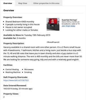There is no evidence of the property being registered with the RTB [Residential Tenancies Board] for the existing tenants. It’s unclear if the landlord has set up the property as a HMO. For accountability, proof of owner must be part of the advertising process…