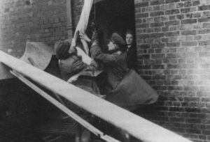 ‘At 12 noon today, the General Officer Commanding the Irish Defence Forces, Curragh Training Camp, in County Kildare, Brigadier General Brendan McGuinness (above), raises the Irish Tricolour flag on top of the Watertower, at the same spot it was raised by Lieut General Ginger O’Connell (top centre), 100 years ago today….