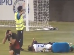 During yesterdays match between Anorthosis and Omonia Nicosia in Cyprus, a thug in the crowd (possibly inspired by a similarly classy display in Iran last month) throws an expolsive at an injured Anorthosis player.