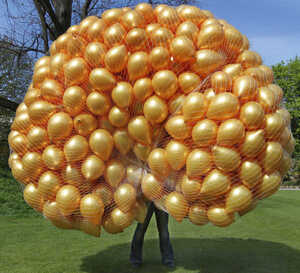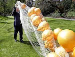 Science newbie Sara Walshe holding 550 balloons at the BT Young Scientist and Technology Exhibition 50th birthday launch in the grounds of government buildings Iveagh Gardens, Dublin, today.