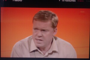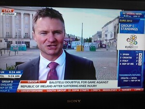 A glorious defiant tricolour on the BBC’s football coverage last night – Steve Staunton: green(ish) shirt, white face, orange background.