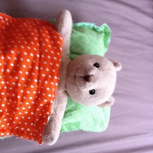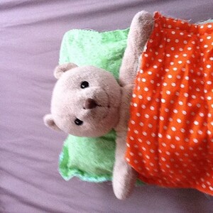 My son’s defiant teddy bear in his defiant tricolour sleeping bag!!