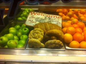 The carefully arranged fruit and bread from the bakery beside my office in San Francisco.