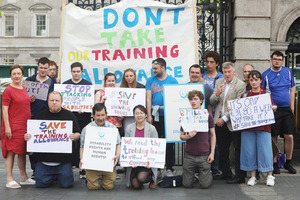 Students from the National Learning Network, including top from left: Melissa Harrington and Megan Collins, affected by the axing of an allowance which enables people with disabilities to attend training courses and access employment gathered outside the Dáil to appeal to the Minister for Health to reverse the decision.
