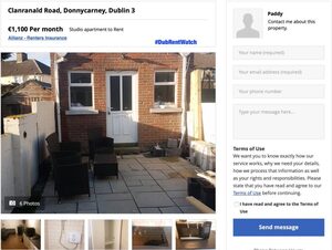 Paddy’s ‘Studio’ is up for rent again €1,100pm. I can find no record of relevant planning. Photos still suggest non-compliance with minimum standards. I was able to track this address down from [an] earlier advert.