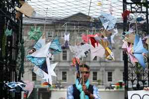 Dublin Lord Mayor Hazel Chu passing an Extinction Rebellion protest outside Leinster House.