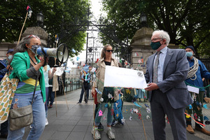 Members of Extinction Rebellion – urging a ‘sea change’ concerning pollution, over-fishing and habitat destruction in our seas – hand a petition reflecting these concerns to Minister of State for Heritage and Electoral Reform Malcolm Noonan (above right) outside Leinster House.