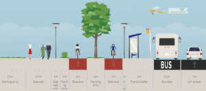 ...The images below show an outline concept — note: this will work with or without changing the current roadway (for a BRT route or whatever). And also note that this is a concept, while it will fit, the measurements here aren’t supposed to directly relate to any one section (the widths vary).