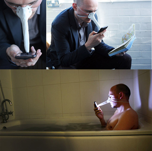 Created by admitted bathtub smartphone user Dominic Wilcox using plaster wrapped around an existing touchscreen stylus, the extended proboscis is long enough to reach the screen at a distance where you can still focus on it.