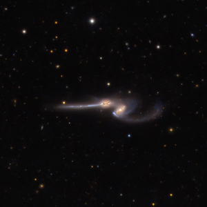 Behold: NGC 7646, two spiral galaxies also known as The Mice, on account of their long tails. Having already passed through one another, the scamps have been pulling themselves apart ever since. To wit: