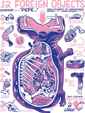 12 objects reportedly removed from the stomach of drug kingpin Pablo Escobar’s pet hippopotamus, Pepe.