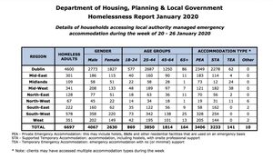 The Department of Housing released its latest homeless figures which showed there were 10,271 people (6,697 adults and 3,574 children) living in emergency accommodation in the final week of January 2020.