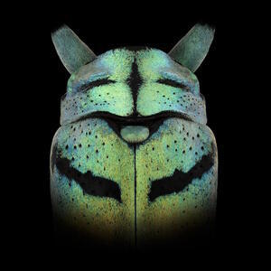 Masked faces emerging pareidolically from subtly lit macro shots of insect bodies by French photographer Pascal Goet.