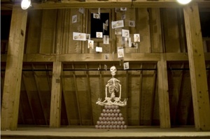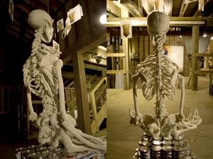 …features a knitted skeleton seated atop a pyramid of Borden’s condensed milk cans and a cloud of screen prints on Plexi glass suspended above it. The knitted skeleton is seated in the lotus position. The prints are of disembodied anatomical parts photographed in high resolution with diagrammatic illustrative overlays.