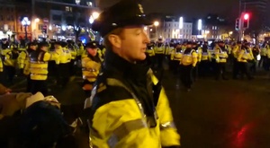 Republican prisoners (possibly Dick Donoghue, left, and Tom Doyle, right) with a Socialist-led British Army escort en route to Kilmainham Gaol in 1916.