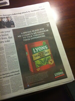 Dodgy Product Placement Admin at 4:01 pm January 17, 2012 Earlier: Tea And Sympathy Now Sponsored (Sasko Lazarov/Photocall Ireland) FacebookTwitterPinterest