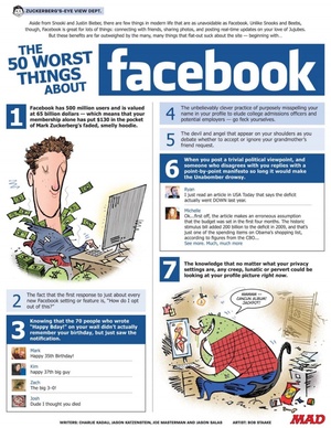 A preview of the June issue of Mad magazine, featuring Zuck and Alfred E. Neuman on the cover and the 50 Worst Things About Facebook inside.