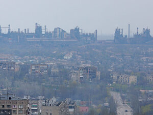 Mariupol, Ukraine with the Azovstal Iron and Steel Works plant behind buildings damaged in the course of Ukraine-Russia conflict