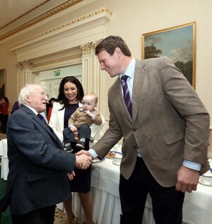 President Higgins and the average-sized rugby ‘ledgebag’ Malcolm O’Kelly ( former Irish lock) at Plan Ireland’s 75th anniversary party this afternoon.