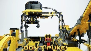 An elaborate LEGO Technics rollercoaster created by LEGO builder Shadow Elenter, driven by 17 separate motors, tested on one unfortunate minifig.