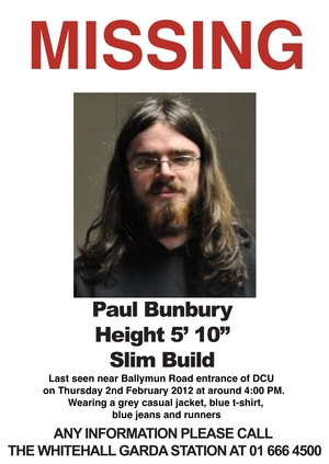 DCU student Paul Bunbury (above) has been missing since Thursday. Paul was last seen in the college campus [Collins Avenue, Glasnevin, Dublin 9] at around 4pm. He hasn’t been online in over 24 hours and his phone is switched off which is out of character for him. If anyone has seen him or has any information please contact Whitehall garda station on (o1)6664500. There will also be a search at 2pm in DCU meeting at the Helix.