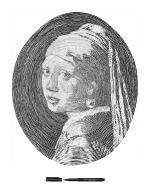 Chan Hwee Chong – combining his art with a promo for Faber Castell Art pens, recreated three masterpieces – including Vermeer’s Girl With A Pearl Earring (above) – each time using a single unbroken spiral of ink.