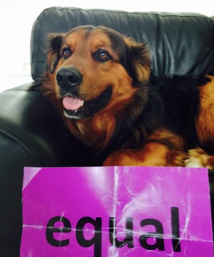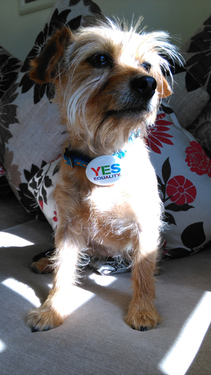 My friend Geraldine’s gorgeous doggie Izzy (top) rocking her campaign badge and Yes bandana and my friend Julie’s three-legged wonder Georgie thinking that if she had opposable thumbs and a vote (and wasn’t a dog) she’d be voting Yes!