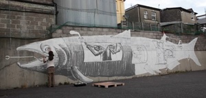 Recent work by Phlegm featuring the Welsh artist’s busy, combative Brundlefly-looking folk doing their monochromatic thing in Sweden (top three pix) and in collaboration with fellow artists Sweet Toof, Teddy Baden, Run, and Mighty Mo at Hackney Wick in London.