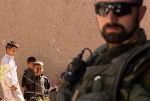 An Italian soldier of NATO’s International Security Assistance Force (ISAF) stands guard as an Afghan boy aims a toy pistol inside Herat’s prison, in western Afghanistan on September 14, 2010.