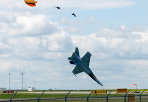 Pilot Capt. Brian Bews parachutes to safety just as his CF-18 fighter jet plummets to the ground during a practice flight at the Lethbridge County Airport for the weekend airshow in Lethbridge, Alberta, Canada on July 23, 2010.