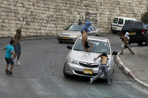 An Israeli motorist runs down a masked Palestinian youth who was standing among a group of youngsters throwing stones at Israeli cars on October 8, 2010 in the mostly Arab east Jerusalem neighborhood of Silwan
